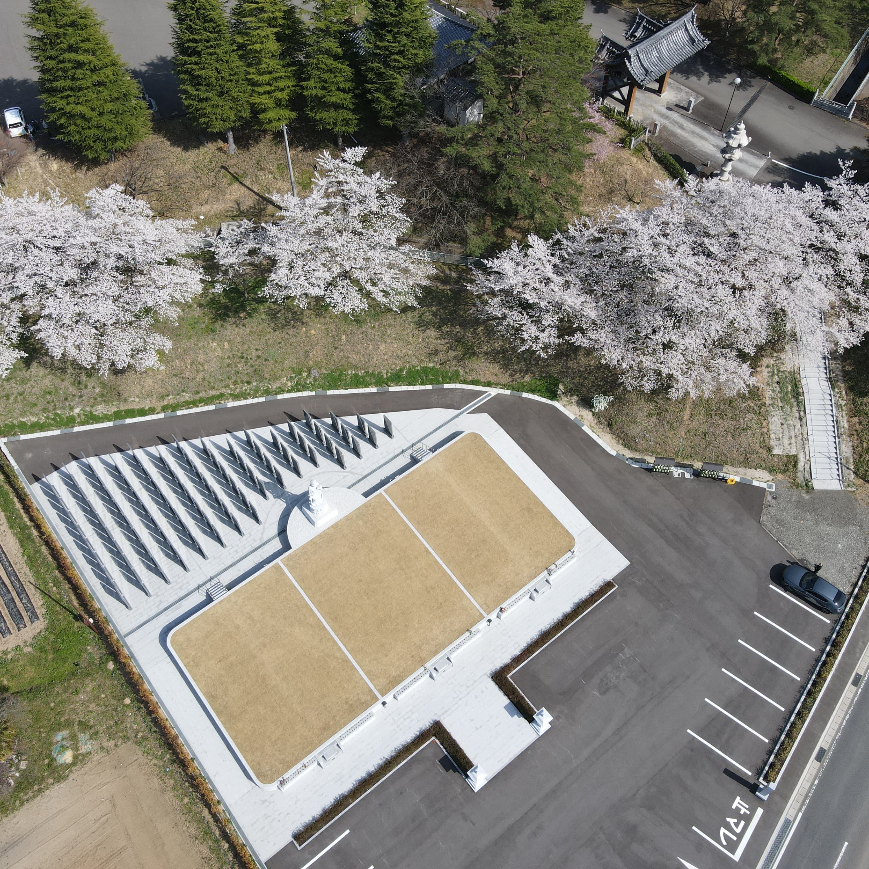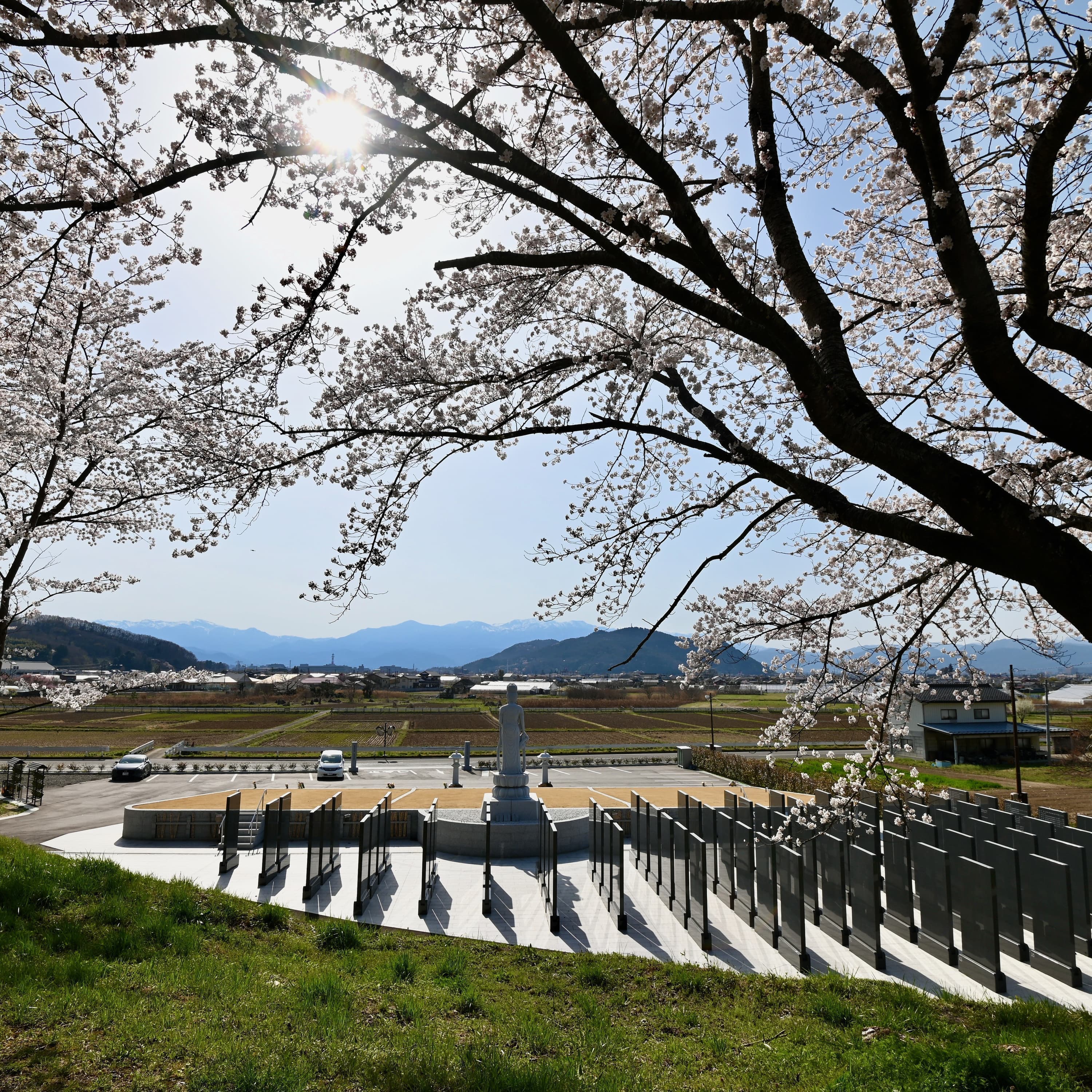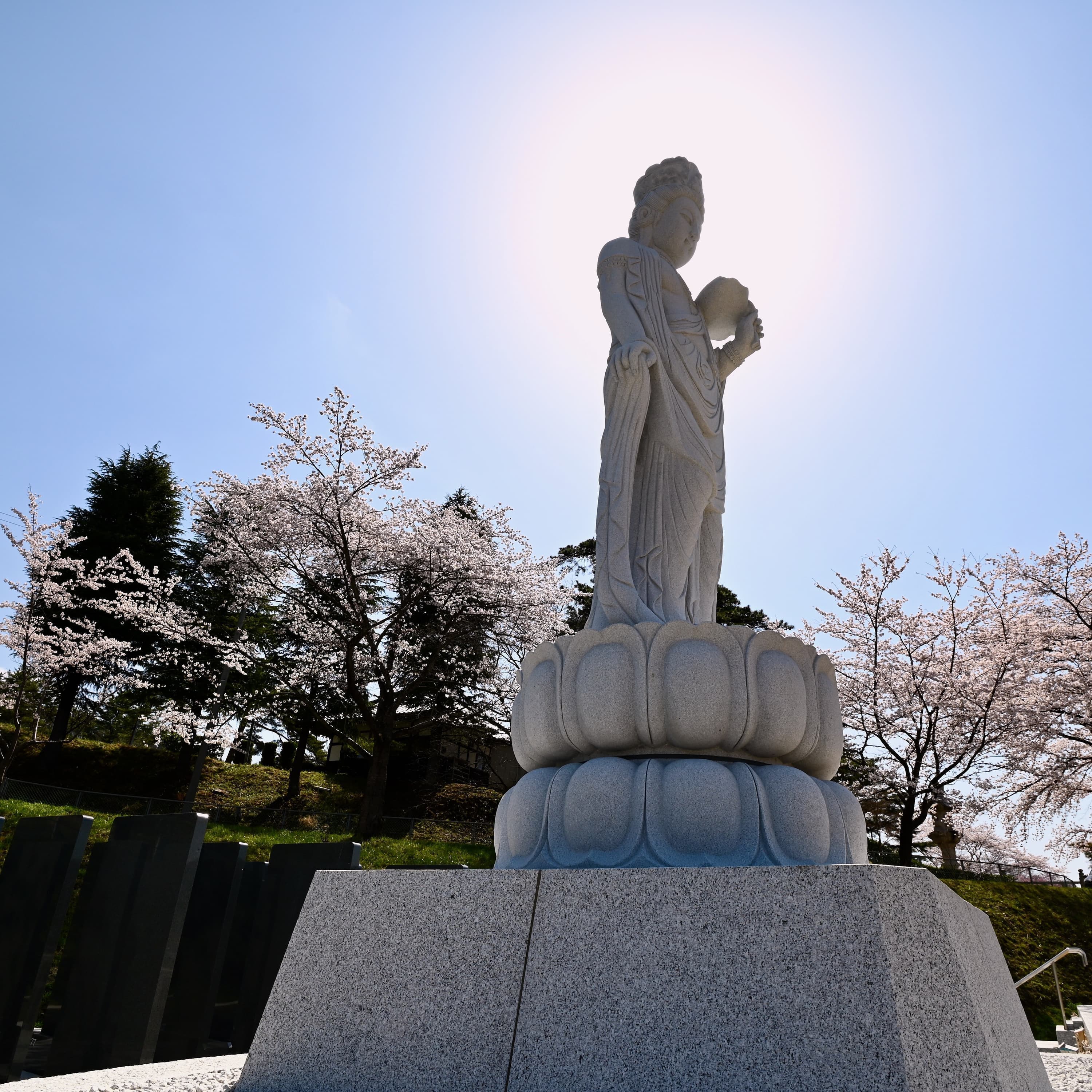 福島盆地を一望する安洞院・しのぶ霊園境内に、新しいお墓ができました。安洞院の山門付近の見事な桜並木を背に、青々とした芝生が敷き詰められた、墓標を個別に立てない自然葬形式の永代供養墓地です。朝陽を背に浴びる観音菩薩像の望む先には美しい福島盆地の山の稜線と福島市のシンボル信夫山。豊かな自然に囲まれた、完全バリアフリーの明るい霊苑です。多くのみなさまとご縁が結ばれることを念じております。