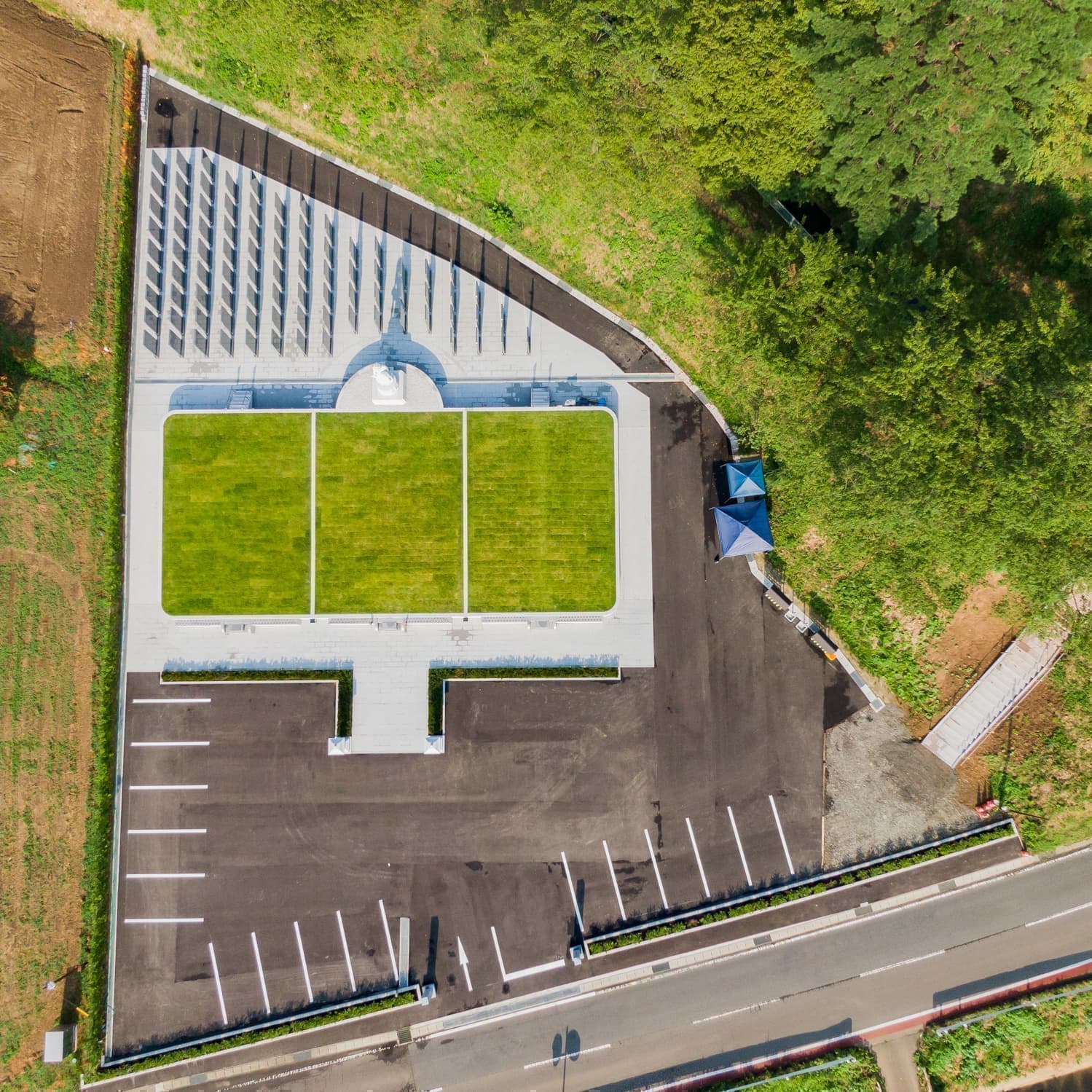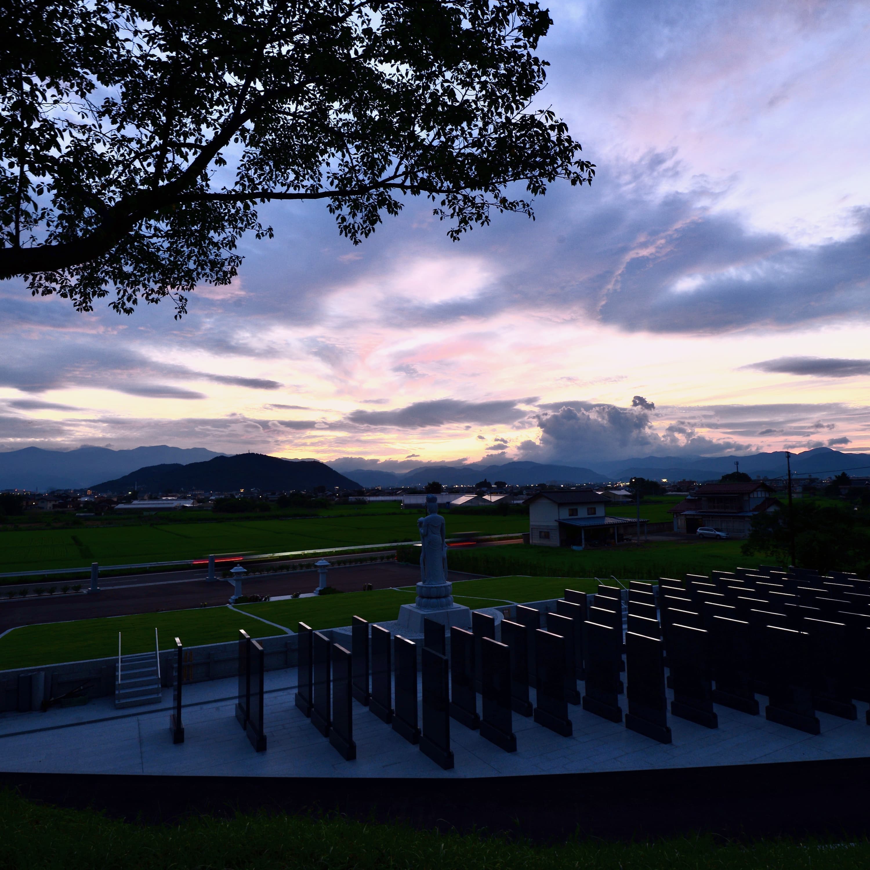 「祈りの丘さくら」からは福島盆地の美しい山々の稜線に夕日が沈む景色をご覧いただけます。福島市のシンボル信夫山は朝日を浴びて美しく輝き、その背後にそびえる吾妻小富士、左手には安達太良山の稜線が広がります。「ほんとうの空」があると謳われた福島、青い空と山、のどかな田園の原風景を借景にするロケーションは、福島の美しい自然を愛するすべての方々にとっての安息の地でもあります。