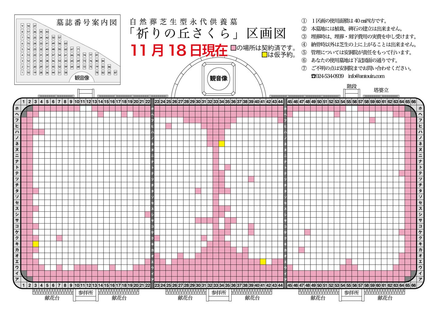 「祈りの丘さくら」の現在の申し込み状況は下記の通りです。お線香を供える参拝所周辺、手で触れることができる区画、観音像周辺など、申し込みがいくつかのエリアに集中しています。更新の時期により若干の差が出てしまう場合がございます。現況優先といたします。