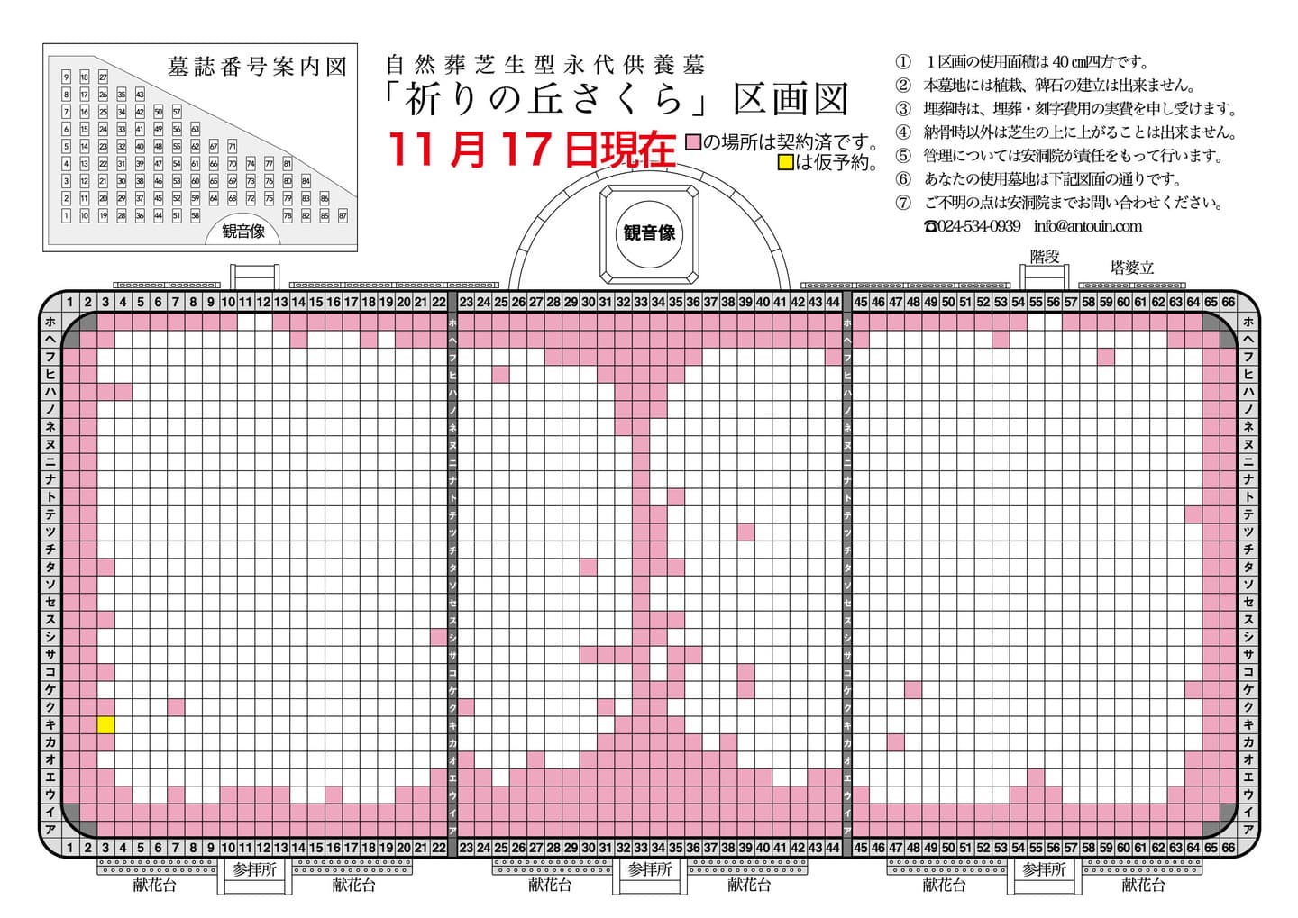「祈りの丘さくら」の現在の申し込み状況は下記の通りです。お線香を供える参拝所周辺、手で触れることができる区画、観音像周辺など、申し込みがいくつかのエリアに集中しています。更新の時期により若干の差が出てしまう場合がございます。現況優先といたします。