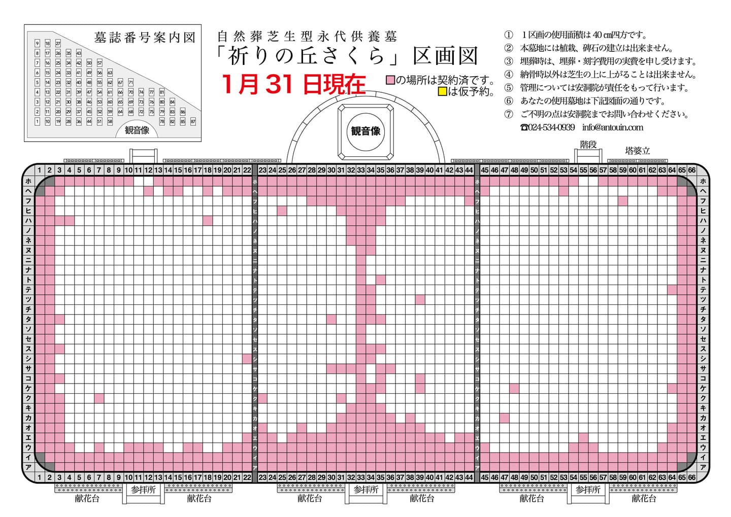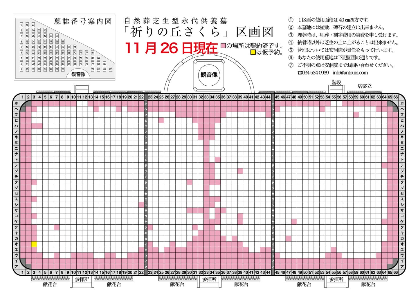 「祈りの丘さくら」の現在の申し込み状況は下記の通りです。お線香を供える参拝所周辺、手で触れることができる区画、観音像周辺など、申し込みがいくつかのエリアに集中しています。更新の時期により若干の差が出てしまう場合がございます。現況優先といたします。